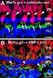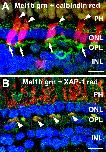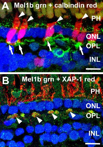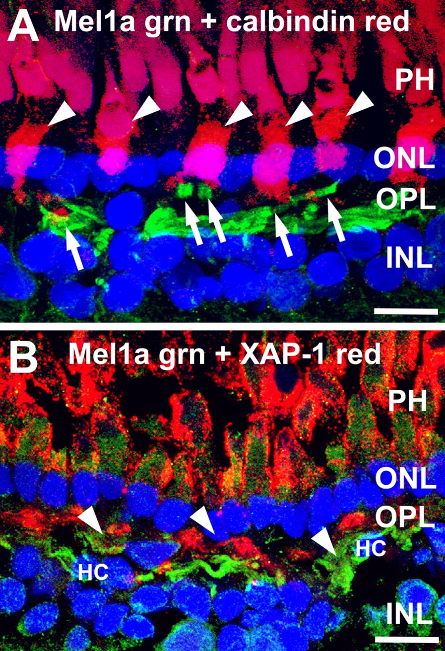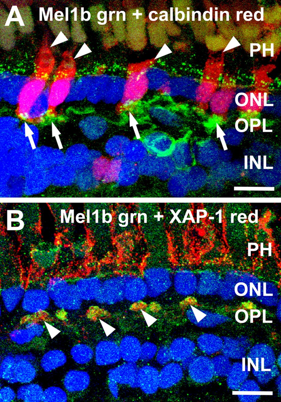 Figure 7. Mel1a melatonin receptor-immunoreactive processes in the outer plexiform layer (OPL) contact cone photoreceptor terminals. A: Branches of Mel1a-immunoreactive processes (green; arrows) ascend through the OPL to contact the terminals of calbindin-immunoreactive cone photoreceptors (red; arrowheads) terminals. Confocal image stack comprised of 11 optical slices of â400 nm each. B: Mel1a melatonin receptor-immunoreactive processes (green; arrowheads) in the OPL contact XAP-1-immunoreactive cone photoreceptor terminals (red). The extracellular matrix surrounding the inner and outer segments of the photoreceptors is also XAP-1-immunoreactive. Confocal image stack comprised of 10 optical slices of â400 nm each. Nuclei are counterstained with DAPI (blue) in both panels. PH, photoreceptor inner segments; ONL, outer nuclear layer; INL, inner nuclear layer. Scale bars = 10 μm in both panels.