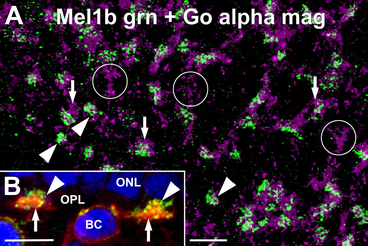 Figure 8. Mel1b receptor-immunoreactive OFF bipolar cell dendrites and Mel1a receptor-immunoreactive horizontal cell axons contact the same cone terminals. Immunolabeling for Mel1b (green) and Mel1a (magenta) in a retinal flatmount focused at the level of the outer plexiform layer (OPL). Mel1b-immunoreactive OFF bipolar cell dendrites (arrowheads) and Mel1a-immunoreactive horizontal cell axons (arrows) selectively contact the same cone terminals. Confocal image stack comprised of seven optical slices of ≈400 nm each. Scale bar = 10 μm.