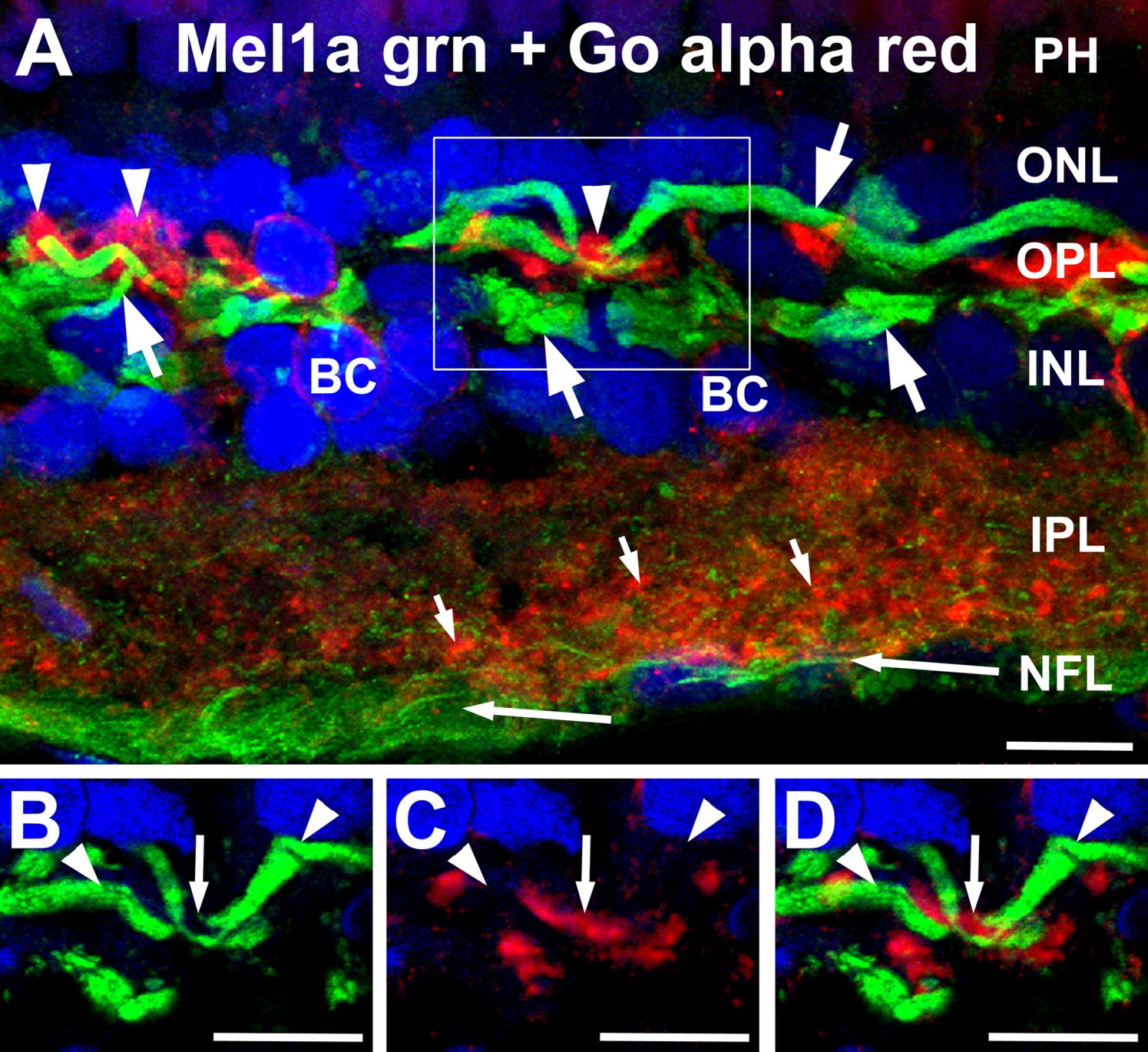 Figure 6. Mel1a receptors are not expressed in ON bipolar cell dendrites. A: Labeling for Mel1a receptor (green) and Goα (red) localize to different processes in the outer plexiform layer (OPL). Mel1a receptors are expressed in distinctive processes morphologically similar to horizontal cell axons (large arrows). These processes are distinct from the Goα-immunoreactive ON bipolar cell dendrites (arrowheads). Apparent colocalization of Mel1b and Goα immunoreactivity in processes in the outer plexiform layer (OPL) is due to their close proximity and the relative thickness of the image stack, and does not represent genuine colocalization (see panels BâD, below). Mel1a immunoreactivity also is present in puncta throughout the inner plexiform layer (IPL; small arrows) and in ganglion cell axons (long arrows) in the nerve fiber layer (NFL). Confocal image stack comprised of 15 optical slices of â400 nm each. The box indicates the area shown in panels BâD. BâD: Examination of thin stacks of confocal optical planes confirms that Mel1a labeling is not localized to ON bipolar cell dendrites. Images in panels BâD are comprised of five optical slices of â400 nm each. B: Mel1a immunoreactivity in horizontal cell axons (arrowheads) in the OPL. C: ON bipolar cell dendrites labeled for Goα (small arrow). D: Overlay of panels B,C showing that ON bipolar cell dendrites (Goα-positive) and Mel1a receptor-positive processes are not colocalized. Nuclei are counterstained with DAPI (blue) in all panels. BC, Bipolar cell; PH, photoreceptors; IPL, inner plexiform layer; NFL, nerve fiber layer. Scale bars = 10 μm in all panels.