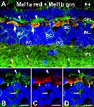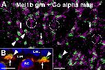 Figure 5. Mel1b receptor-immunoreactive OFF bipolar cell dendrites and ON bipolar cell dendrites are spatially segregated at cone terminals. A: Immunolabeling for Mel1b (green) and Goα (magenta) in a retinal flatmount preparation focused at the level of the outer plexiform layer (OPL). Mel1b-immunoreactive OFF bipolar cell dendrites (arrowheads) and Goα-immunoreactive ON bipolar cell dendrites (arrows) both contact the same cone terminals, but tend to contact cone terminals in discrete locations. Occasionally, cone terminals receiving numerous contacts from Goα-immunoreactive ON bipolar cell dendrites, but little or no contacts from Mel1b-immunoreactive OFF bipolar cell dendrites were observed (circles), suggesting that Mel1b-immunoreactive OFF bipolar cells may not contact all cone types equally. Confocal image stack comprised of nine optical slices of ≈400 nm each. B: Mel1b (green) and Goα (red) immunolabeling in the OPL in vertical frozen sections of retina shows that Mel1b-immunoreactive OFF bipolar cell dendrites (arrowheads) penetrated slightly deeper into the cone terminals than Goα-immunoreactive ON bipolar cell dendrites (arrows). An ON bipolar cell body (BC) labeled for Goα is also visible. Nuclei are counterstained with DAPI (blue). Confocal image stack comprised of seven optical slices of 400 nm each. Scale bars = 10 μm for both panels.