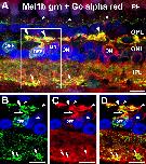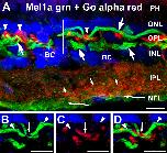 Figure 4. Mel1b receptors are expressed by OFF bipolar cells. A: Double labeling for Mel1b receptors (green) and the ON bipolar cell marker Goα (red) shows that Mel1b receptor-immunoreactivity is absent from the cell bodies of ON bipolar cells (ON), identifying the Mel1b receptor-immunoreactive bipolar cells as OFF bipolar cells (OFF). Confocal image stack comprised of seven optical slices of 400 nm each. Apparent colocalization of Mel1b and Goα immunoreactivity in processes in the outer plexiform layer (OPL) is due to their close proximity and the relative thickness of the image stack, and does not represent genuine colocalization (see panels BâD, below). Immunolabeling for both Mel1b and Goα is present in the inner plexiform layer (IPL), with strongly Mel1b-positive processes (small arrows) present along the inner margin of the layer. Mel1b immunoreactive puncta (small arrowheads) are also present at the level of the outer limiting membrane (OLM). The box in (A) indicates area shown in panels BâD. BâD: Examination of a single confocal optical plane confirms that Mel1b labeling does not colocalize with labeling for Goα in ON bipolar cells. Images in panels BâD represent a single optical slice of â400 nm. B: Mel1b immunoreactivity in the cell body and primary and secondary dendrites (arrow and large arrowhead respectively) of a bipolar cell (OFF). C: ON bipolar cell dendrites labeled for Goα (small arrowheads). D: Overlay of panels B,C showing that ON bipolar cell dendrites are devoid of Mel1b receptor labeling. Nuclei are counterstained with DAPI (blue) in all panels. INL, inner nuclear layer; PH, photoreceptor inner segments. Scale bars = 10 μm in all panels.
