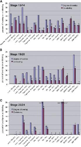 Fig. 5. Overlap versus co-labeling of selected adjacent placodes at neural plate stages (A), at the end of neurulation (B) and at early tailbud stages (C). The degree of overlap (blue columns) was measured as percent of area of origin of first placode which overlapped with area of origin of second placode. Areas were defined by polygons enclosing all injection sites giving rise to a particular placode in fate maps and measured with ImageJ. Co-labeling (maroon columns) was determined as percent of all injection sites contributing to first placode (n) which also contributed to second placode. Columns marked with an asterisk in C are not very informative since the facial epibranchial placode was labeled by only a single injection site. Abbreviations: ADLL: anterodorsal lateral line; AVLL: anteroventral lateral line; EBVII: Facial epibranchial; EBIX: Glossopharyngeal epibranchial; EBX1: First vagal epibranchial; EBX2/3: Second and third vagal epibranchial; MLL: middle lateral line; PLL: posterior lateral line. |