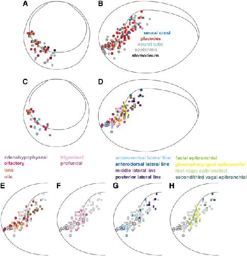 Fig. 6. Fate map of Xenopus dorsal cranial non-neural ectoderm at the neural plate stage (stage 13/14). Each symbol represents one dye injection which contributes to a single placode or other ectodermal fates (circle) or to multiple placodes and/or other ectodermal fates (square). Black outlined circles and squares represent injections shown in frontal views as well as in lateral views. The inner gray colored line marks the ventral border of the outer neural folds. Frontal views are shown in A and C and lateral views in B, DâH. Note that only a subset of rostral injection sites mapped from a lateral view were also mapped from a frontal view. A, B: Positions of placodal precursors (red symbols) in relation to precursors of the neural tube (mint symbols), neural crest (blue symbols), epidermis (light gray symbols) and stomodeum (black symbols). All placodes arise from a crescent-shaped area around the anterior neural plate, the pre-placodal ectoderm. C, D: Positions of precursors for different types of placodes (color coded as indicated). There is extensive overlap and co-labeling of precursors for adjacent placodes. EâH: For clarity, these diagrams highlight injection sites contributing to particular subsets of placodes, while injections which contribute to other placodal fates are shown as light gray symbols. E: Adenohypophyseal, olfactory, lens and otic placodes. F: Trigeminal and profundal placodes. G: Lateral line placodes. H: Epibranchial placodes. For detailed explanation see text. |