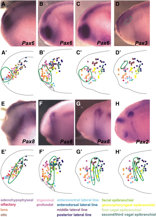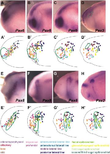 Fig. 10. Comparison of Pax gene expression in Xenopus with placodal fate maps (lateral views). The expression pattern of Pax genes as revealed by in situ hybridization (AâH) were measured at neural plate stages (shown for Pax6 and Pax8: A, E), at the end of neurulation (shown for Pax6 and Pax8: B, F) and in early tail bud stage embryos (shown for Pax6, Pax3, Pax8 and Pax2, C, D, G, H) and compared to fate maps (green encircled areas in Aâ²âHâ²). AâC and Aâ²âCâ²: Pax6 expression encompasses precursors for the olfactory, lens, and trigeminal placodes. D and Dâ²: Pax3 expression is restricted to precursors of the profundal placode (placodal expression domain encircled by hatched green line in D). EâG and Eâ²âGâ²: Pax8 expression is found in precursors of otic, lateral line and epibranchial placodes, but excludes precursors of the vagal epibranchial and posterior lateral line placode. H and Hâ²: Pax2 expression in early tailbud stage embryos is distributed similar to Pax8. Abbreviation: cg: cement gland. For detailed explanation of fate maps, see Figs. 6â8. |