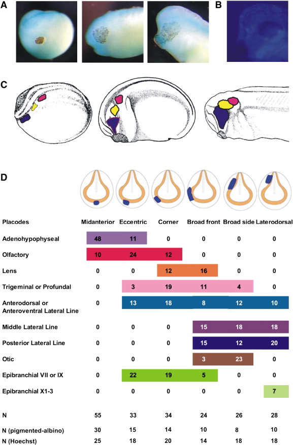 Fig. 3. Fate map of Xenopus non-neural ectoderm at neural plate stages using tissue grafts. A: Example of pigmented graft transplanted into albino host at stage 14 (left panel) and then followed throughout development until mid-tailbud stage (right panel). B: Example of tailbud stage embryo that had received a Hoechst labeled graft at the neural plate stage. C: Changes of shapes of three grafts (blue, yellow, red) between stage 14 (left), stage 22 (middle) and stage 24 (right) projected onto outlines of Xenopus embryos (Nieuwkoop and Faber, 1967). Note the wedge shaped expansion of the anterior graft. D: Summary of placodal fates adopted at tailbud stages (stage 39) by grafts from the indicated positions at neural plate stages. Data are compiled from pigmented and Hoechst-labeled grafts as indicated. Due to the close apposition of some placodes or their derivatives at tailbud stages â viz. the trigeminal and profundal placodes, the anterodorsal and anteroventral lateral line placodes, and the facial and glossopharyngeal epibranchial placodes â it was often not possible to determine whether one or both of these placodes were labeled by a graft and we, therefore, only noted whether any of them were labeled. |
