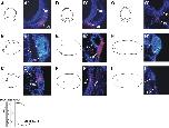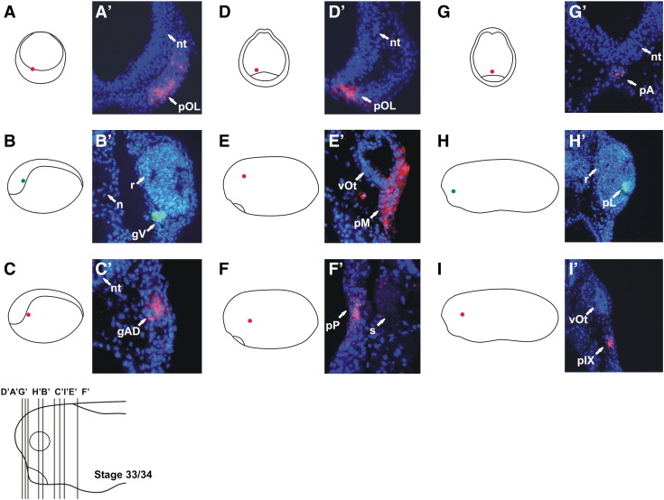 Fig. 4. Examples of DiI or DiO labeled cells and their fates. The positions of DiI (red) or DiO (green) labeled cells in neural plate stage embryos (stage 13/14; A, B, C), at the end of neurulation (stage 19/20; D, E, F) and at early tail bud stage (stage 23/24; G, H, I) are shown. Lateral views in B, C, E, F, H and I, frontal view in A, D and G. Their fates were identified in transverse cryosections at late tail bud stage (stage 33/34) (Aâ²âIâ²). Nuclei are stained with DAPI. Levels of sections are indicated in the diagram below. In neural plate stage embryos, cells at the border of the outer neural folds (A) give rise to cells of the olfactory placode (Aâ²), whereas labeled cells in the outer neural folds (B) were later identified in the trigeminal ganglion (Bâ²), and labeled cells located immediately ventral to the neural folds (C) were found in the ganglion of anterodorsal lateral line nerve (Câ²). At the end of neurulation, a group of cells labeled just dorsal to the cement gland (D), contributes to the olfactory placode (Dâ²); cells labeled more posterior in a dorsal position (E) contribute to the middle lateral line and otic placodes (Eâ²); whereas cells labeled more ventral (F) give rise to the posterior lateral line placode (Fâ²). At early tail bud stage, cells located in the most anterior part of the non-neural ectoderm (G) give rise to the adenohypophysis (Gâ²); labeled cells within the anteroventral part of the non-neural ectoderm (H) contribute to the lens (Hâ²); while cells located more posterior and dorsal (I) developed into a part of the glossopharyngeal epibranchial placode (Iâ²). Abbreviations: gAD: ganglion of anterodorsal lateral line placode; gV: trigeminal ganglion; n: notochord; nt: neural tube; pA: adenohypophyseal placode; pIX: glossopharyngeal epibranchial placode; pL: lens placode; pOL: olfactory placode; pOt: otic placode; pM: middle lateral line placode; pP: posterior lateral line placode; r: retina; s: somite; vOt: otic vesicle. |