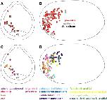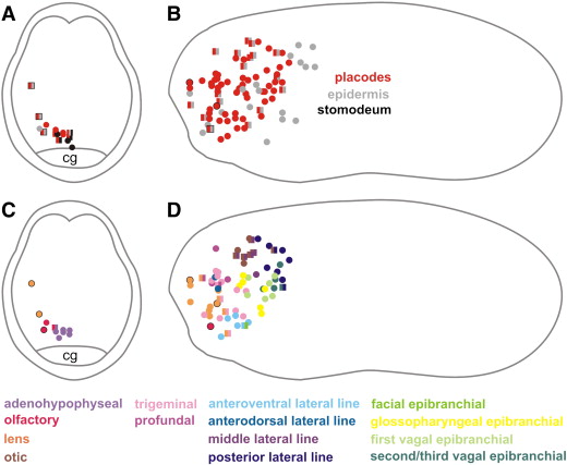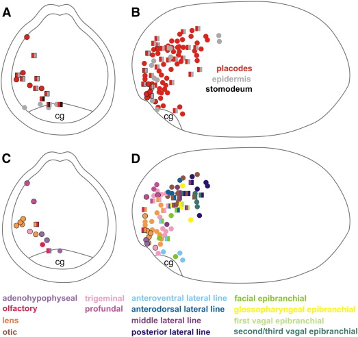 ig. 7. Fate map of Xenopus dorsal cranial non-neural ectoderm at the end of neurulation (stage 19/20). Each symbol represents one dye injection, which contributes to precursors of a single placode or epidermis (circle) or to multiple placodes and/or epidermis (square). Black outlined circles and squares represent injections shown in frontal as well as in lateral views. Frontal views are shown in A and C, lateral views in B and D. A, B: Positions of placodal precursors (red symbols) within the non-neural ectoderm in relation to epidermal (light gray symbols) or stomodeal precursors (black symbols). C, D: Positions of precursors for different types of placodes (color coded as indicated). Overlap and co-labeling between anterior placodes has decreased but is still extensive for posterior placodes. Abbreviation: cg: cement gland. For detailed explanation see text. |