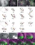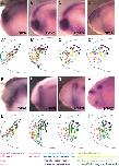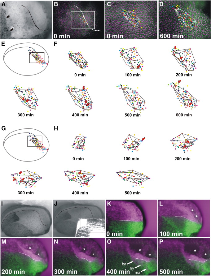 Fig. 11. Cell movements within the non-neural ectoderm (lateral views, anterior is to the right). AâD: Time lapse imaging of deep ectodermal layer in embryo expressing MEM-GFP (green membranes) and H2B-RFP (red nuclei, here shown in magenta false-color) from neural plate stage on until early tailbud stages (600 min). The superficial ectodermal layer was removed. A: Brightfield image of embryo at the beginning of the recording. Hatched line indicates ventral border of neural folds. Arrows indicate border of superficial ectodermal layer. B: Superimposition of both fluorescent channels for embryo at the beginning of the recording. A group of randomly selected cells were color coded (dots) to allow tracking of their positions with ImageJ. C: Magnified view of boxed area in B. Some of the tracked cells are connected by white lines to facilitate visualization of changes in their relative positions over time. D: Same region after 600 min. E, G: Tracking of movements of selected cells for the embryo depicted in AâD. Some tracked cells are connected by black lines. E: Position of tracked cells (grid) in relation to the neural plate stage fate map. F: Changes in positions of tracked cells over time due to cell division (red arrows) and local cell rearrangement. G, H: Similar analysis for time lapse movie of a different embryo. IâP: Time lapse imaging of deep ectodermal layer in embryos expressing EosFP from neural plate stage on for 500 min. I: Bright- field image of embryo after removal of the superficial ectodermal layer. Hatched line indicates ventral border of neural folds. J: Part of the embryo was covered with aluminum foil and UV irradiated for photoconversion of EosFP resulting in a sharp boundary between photoconverted (red; here shown in magenta false-color) and unconverted (green) fluorescent cells. KâP: Magnified view of anterior end of embryo depicted in I and J with superimposition of both fluorescent channels. The sharp border created by photoconversion of EosFP (dashed white lines) within the deep ectodermal layer largely persists until early tailbud stages. Because a large part of the neural plate and the neural crest was photoconverted in this embryo, the ventral migration of neural crest cells (magenta) underneath the deep layer of the ectoderm can be seen (indicated by white arrows in O). From 100 min on, a space begins to open up in the dorsal part of the embryo (asterisks), probably due to the delamination of neural crest cells (this was observed in several embryos after removal of the superficial ectodermal layer). Abbreviations: ba: branchial neural crest stream; hy: hyoid neural crest stream; ma: mandibular neural crest stream. |