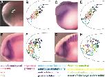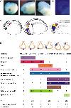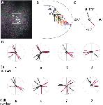 Fig. 12. Analysis of cell neighborhood changes over time. A: Magnified view of rostral non-neural ectoderm of the neural plate stage embryo depicted in Figs. 11AâB (lateral view, anterior is to the right) showing MEM-GFP labeled membranes (green) and H2B-RFP labeled nuclei (red; here shown in magenta false-color). For eight target cells in the deep ectodermal layer (white dots), positions of all neighboring cells including all cells that leave and cease to be neighbors and all cells which become new neighbors were tracked over a time period of 600 min. B: Positions of these target cells (black dots) in relation to the neural plate stage fate map. C: Directions of cells moving away from or towards a target cell (black circle) were depicted as arrows pointing towards or away from it. Red arrows indicate the directions (0°â360°) into which old neighbors were lost, while black arrows indicate directions (0°â360°) from where new neighbors were gained. Directions were categorized into 45° sectors. The number R within the black circle indicates the number of neighbors that do not change over the recorded time period. D: Cell neighborhood changes for each of the eight cells depicted in A. In total, the neighborhood changes of 30 cells were analyzed. |