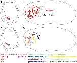 Fig. 8. Fate map of Xenopus dorsal cranial non-neural ectoderm at early tail bud stage (stage 23/24). Each symbol represents one dye injection, which contributes to precursors of a single placode or epidermis (circle) or to multiple placodes and/or epidermis (square). Black outlined circles and squares represent injections shown in frontal as well as in lateral views. Frontal views are shown in A and C, lateral views in B and D. A, B: Positions of placodal precursors (red symbols) within the non-neural ectoderm in relation to epidermal (light gray symbols) or stomodeal precursors (black symbols). C, D: Positions of precursors for different types of placodes (color coded as indicated). Placodes are now more separated from each other. Abbreviations: cg: cement gland. For detailed explanation see text. |