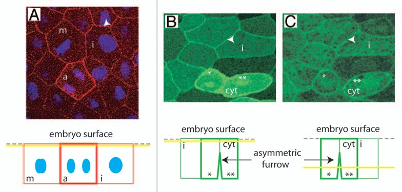 (m: metaphase, a: anaphase). The yellow line on the scheme at the bottom indicates the position of the confocal plane relative to the cell surface. DN A