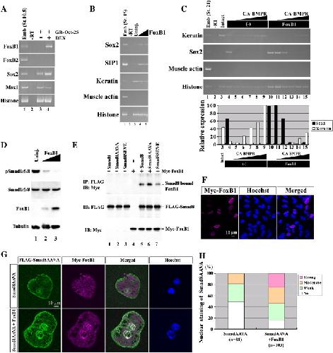 Fig. 1. Xenopus FoxB1, acting downstream of Oct-25, promotes neural induction and suppresses BMP-dependent epidermal differentiation. (A) The expression of Xenopus FoxB1 is activated by the Oct-25 transcription factor. GR-Oct-25 mRNA (1000 pg) was injected into the animal pole of 4-cell stage embryos. Ectodermal explants were isolated at the blastula stage, treated with or without dexamethazone (DEX) to activate Oct-25, cultured until the early gastrula stage (st. 10.5), and analyzed by semi-quantitative RT-PCR. Emb and âRT indicate whole embryo RNA processed in the presence or absence of reverse transcriptase, respectively. Histone was used as a loading control. (B) Overexpression of FoxB1 promotes neural induction and inhibits epidermal differentiation. GR-FoxB1 mRNA (500 pg and 1000 pg) was injected into the animal pole of 4- to 8-cell stage embryos. Ectodermal explants were isolated at the blastula stage, treated with DEX to activate FoxB1 and cultured until early neurula stage (st. 15). The expression of marker genes was determined by semi-quantitative RT-PCR. FoxB1 induced the expression of neural markers Sox2 and SIP1 with a moderate reduction in the expression of epidermal keratin (lanes 4 and 5). Expression of the mesodermal marker muscle actin was not induced by FoxB1 activation. (C) FoxB1 inhibits epidermal keratin gene expression induced by a constitutively activated BMP type I receptor (CA-BMPR) and promotes Sox2 gene expression. The changes in the gene expression profile were determined by semi-quantitative RT-PCR (upper panel) and further confirmed by quantitative real-time PCR (QPCR) (lower panel) using the same RNA samples shown in the upper panel. Increasing amounts of CA-BMPR mRNA (9, 19, 38, 75 and 150 pg) were injected alone or together with GR-FoxB1 mRNA (1000 pg) into the animal pole of 2-cell stage embryos. Ectodermal explants were isolated at the blastula stage, and dissociated for 6.5 h (lanes 4â15). Cells were treated with DEX to activate FoxB1 during the dissociation, reaggregated and cultured until neurula stages (st. 21). âIntactâ indicates intact ectodermal cells obtained from uninjected embryos. The QPCR data are shown as arbitrary units normalized to ornithine decarboxylase (ODC) gene expression. (D) FoxB1 decreases endogenous levels of phosphorylated Smad1/5/8 in Xenopus ectodermal cells. Increasing amounts of GR-FoxB1 mRNA (500 pg and 1000 pg) were injected into the animal pole of 4- to 8-cell stage embryos. Embryos were treated with DEX and ectodermal explants were isolated at the blastula stage, cultured until the early gastrula stage (st. 10.5). Whole cell lysates from explants were immunoblotted with anti-phospho Smad1/5/8, anti-Smad1/5/8, anti-HA and anti-Tubulin antibodies, respectively. GR-FoxB1 was tagged at the C-terminus with the HA epitope. Tubulin was used as a loading control. (E) FoxB1 interacts preferentially with a non-phosphorylatable mutant form of Smad8 (Smad8AAVA) rather than a phospho-mimicking mutant form of Smad8 (Smad8SEVE) and wild-type Smad8. HeLa cells were transfected with the indicated combination of expression constructs (Myc-tagged FoxB1 and different constructs of Flag-tagged Smad8). The Flag-tagged Smad8 constructs were immunoprecipitated (IP) from transfected cells with anti-FLAG antibodies, and the immunoprecipitates were then immunoblotted (IB) with anti-Myc antibodies (top panel). Input extracts were immunoblotted with the indicated antibodies (the lower two panels). (F) Wild-type FoxB1 is localized to the nucleus of HeLa cells. Transfected cells with Myc-FoxB1 DNA were immunostained with anti-Myc antibody (magenta, left panel). Nuclei were visualized with Hoechst 33342 (blue, middle panel). The merged image is shown in the right panel. Scale bar, 10 μm. (G) Effect of FoxB1 on the subcellular localization of Smad8AAVA in Xenopus ectodermal cells. Dissociated ectodermal cells from embryos injected with FLAG-Smad8AAVA mRNA alone (top panel) or both FLAG-Smad8AAVA and Myc-GR-FoxB1 mRNA (lower panel), were immunostained with anti-FLAG (green) and anti-Myc (magenta) antibodies. Nuclei were visualized with Hoechst 33342 (blue). In the absence of FoxB1, Smad8AAVA was localized to both the cytoplasm and nucleus (upper panels), whereas Smad8AAVA together with FoxB1 accumulated in the nucleus (lower panels). Scale bar, 10 μm. (H) Summary of data from independent experiments presented in (G). The intensity of FLAG-Smad8AAVA staining in the nucleus was compared with that in the cytoplasm and scored as follows: no (no significant difference to that in the cytoplasm), weak, moderate, or strong nuclear staining. Numbers of Smad8AAVA-positive cells analyzed in independent fields are indicated below the bars. |