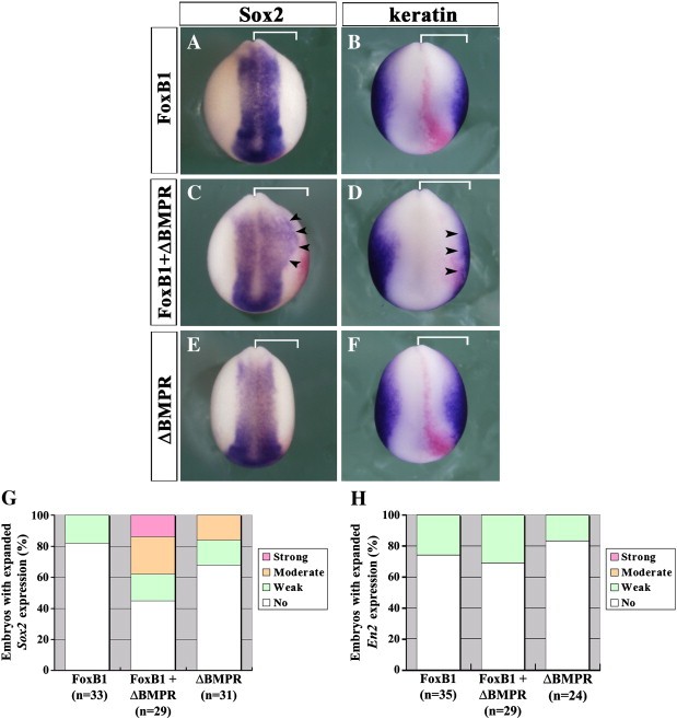 Fig. 2. FoxB1 cooperates with inhibition of BMP signaling to promote commitment to neural fate at the expense of epidermal fate. (AâF) FoxB1 cooperates with the inhibition of BMP signaling (dominant negative BMP receptor, delta-BMPR) to expand the expression of the neural plate marker Sox2 (arrowheads, C) at the expense of epidermal keratin expression (arrowheads, D). Together with beta-galactosidase (beta-gal) mRNA, GR-FoxB1 (250 pg) and delta-BMPR mRNA (125 pg) were injected unilaterally into both dorsal and ventral animal blastomeres of 8-cell stage embryos as indicated. The expression of Sox2 (A, C, and E) and epidermal keratin (B, D, and F) analyzed by in situ hybridization is shown in purple and beta-gal is stained in red. The injected side of the embryo is indicated by brackets. All panels show dorsal views with posterior to the top. (G) FoxB1 and delta-BMPR cooperatively expand the expression domain of Sox2. Summary of phenotypes shown in (A), (C) and (E). Each experiment was repeated more than twice and gave similar results. (H) FoxB1 and delta-BMPR do not cooperatively expand the expression domain of En2. Photographs of stained embryos are not presented. |