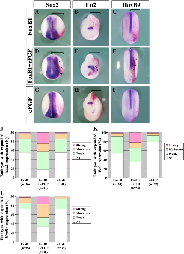 Fig. 3. FoxB1 cooperates with FGF signaling to promote neural development. (AâI) FoxB1 cooperates with eFGF to promote neural induction and posterior neural formation. Together with β-gal mRNA, GR-FoxB1 (250 pg) and eFGF mRNA (0.25 pg) were injected unilaterally into both dorsal and ventral animal blastomeres of 8-cell stage embryos as indicated. The expression of neural markers Sox2 (neural plate; A, D and G), En2 (midbrainâhindbrain boundary; B, E, and H), and HoxB9 (spinal cord; C, F and I) analyzed by in situ hybridization is shown in purple and β-gal is stained in red. The embryos injected with both GR-FoxB1 and eFGF mRNA displayed a more pronounced expansion of Sox2, En2 and HoxB9 expression (arrowheads in D, E and F, respectively), compared to embryos injected with either mRNA alone (AâC and GâI). The injected side of the embryo is indicated by brackets. All panels show dorsal views with posterior to the top, except for En2 (B, E, and H) where the anterior (front) view with dorsal to the top is shown. (JâL) Summary of phenotypes shown in (A)â(I). FoxB1 and eFGF cooperatively expand expression domains of Sox2 (J), En2 (K) and HoxB9 (L) genes. Each experiment was repeated more than twice and gave similar results. |