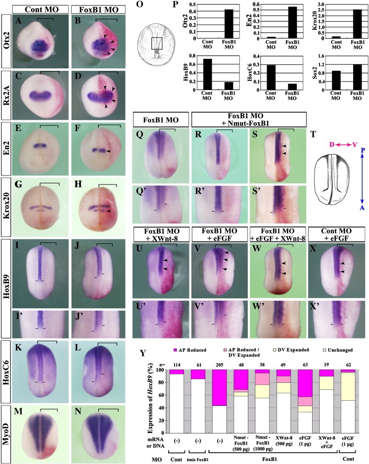 Fig. 5. FoxB1 is required for the formation of posterior neural tissue and the suppression of anterior tissue. (AâN) Together with β-gal mRNA, either Control MO (34 ng, left columns) or FoxB1 MO (34 ng, right columns) were injected unilaterally into the 2-cell stage embryos. The expression of Otx2 (fore- and mid-brain; A and B), Rx2A (retina; C and D), En2 (mid-hindbrain boundary; E and F), Krox20 (hindbrain; G and H), HoxB9 (spinal cord; I-Jâ²), HoxC6 (spinal cord; K and L), and MyoD (paraxial mesoderm; M and N) genes analyzed by in situ hybridization is shown in purple and β-gal is stained in red. In embryos injected with FoxB1 MO, the expression of Otx2, Rx2A, En2 and Krox20 (corresponding to rhombomere 3) on the injected side was expanded (arrowheads; B, D, F and H) and the expression of HoxB9 (J and Jâ²) and HoxC6 (L) was decreased and shifted posteriorly (the horizontal lines mark approximate anterior limits of the expression). The expression pattern of MyoD was not significantly affected by FoxB1 MO (N). The injected side of the embryo is indicated by brackets. AâH: anterior (front) view with dorsal to the top; IâN: dorsal view with posterior to the top. (O and P) Expression of anteriorâposterior marker genes in dorsal ectodermal explants. Embryos were injected with Control or FoxB1 MO (34 ng/blastomere) at 2-cell stage and cultured until late gastrula stage (st. 12.5). Dorsal ectodermal explants were isolated from a presumptive posterior neural plate region indicted by a black square (O). The isolated explants were cultured until the neurula stage (st. 21) and analyzed by QPCR (P). The relative level of expression (arbitrary units) normalized to ODC expression is shown for each gene. Each experiment was repeated more than twice and gave similar results. (Q-Xâ²) FoxB1 acts together with Wnt and FGF signaling to promote posterior neural development. Together with β-gal mRNA, the 2-cell stage embryos were injected unilaterally with a mixture of MO and mRNA or DNA as indicated: FoxB1 MO alone (34 ng; Q and Qâ²); FoxB1 MO with Nmut-FoxB1 mRNA (1000 pg; RâSâ²), XWnt-8 DNA (500 pg; U and Uâ²), eFGF mRNA (1 pg; V and Vâ²) or both XWnt-8 DNA (500 pg) and eFGF mRNA (1 pg; W and Wâ²); Control MO (34 ng) with eFGF mRNA (1 pg; X and Xâ²). Expression of the HoxB9 gene analyzed by in situ hybridization is shown in purple and β-gal is stained in red. Nmut-FoxB1 partially but significantly rescued the reduction of HoxB9 expression by FoxB1 MO (horizontal lines, compare Qâ² with Râ² and Sâ²). Moreover, in embryos injected with FoxB1 MO and XWnt-8 DNA, the expression of HoxB9 was rescued partially (horizontal lines, Uâ²) and coexpression of XWnt-8 and eFGF showed slightly better rescuing activities (W and Wâ²). eFGF alone (1 pg; V and Vâ²) was not able to rescue the expression of HoxB9 in the anteriorâposterior (AP) direction. In some embryos, HoxB9 expression was even expanded in the dorsal-ventral (DV) direction (arrowheads, SâX). The injected side of the embryo is indicated by brackets. All panels show dorsal views with posterior to the top. (Y) Summary of phenotypes obtained from several experiments shown in (I)â(Jâ²) and (Q)â(Xâ²). The degree of recovery in the HoxB9 expression domains was scored according to the direction of change along the AP or DV axis as shown in (T), and categorized into three types: reduced along the AP axis (AP reduced), reduced along the AP axis with expansion along the DV axis (AP reduced/DV expanded), and expansion along the DV axis (DV expanded). Numbers of embryos per experimental group are indicated above the bars. |