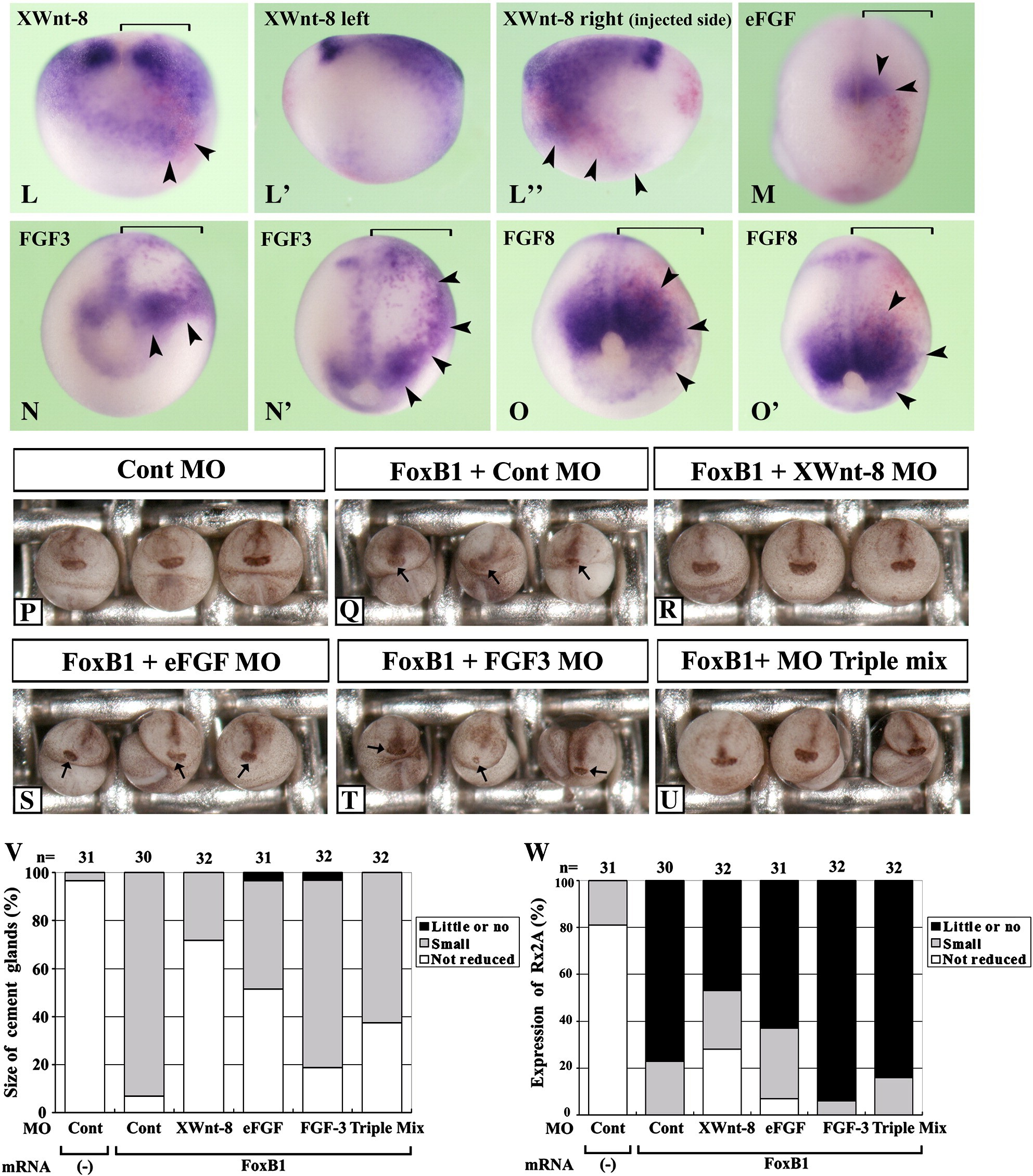 Fig. 6b. FoxB1 suppresses anterior development via the expression of Wnt and FGF ligands. (Lâ²) FoxB1 expands the expression domain of Wnt and FGF ligand genes in embryos. Together with β-gal mRNA, GR-FoxB1 mRNA (500 pg) was injected unilaterally into both dorsal and ventral animal blastomeres of 8-cell stage embryos. The expression of XWnt-8 (Lâ²; st. 15/16), eFGF (M; st. 15/16), FGF3 (N and Nâ²; st. 12.5) or FGF8 (O and Oâ²; st. 12.5) analyzed by in situ hybridization is shown in purple and β-gal is stained in red. Upon overexpression of FoxB1, the expression of XWnt-8 expands laterally and ventrally around the posterior part of the embryo (arrowheads, L and Lâ²). The expression of FGF ligands was also found to be expanded (arrowheads, Mâ²). The injected side of the embryo is indicated by brackets. L, M, N, and O: posterior views with dorsal to the top; Nâ² and Oâ²: dorsal view of (N) and (O), respectively, with anterior to the top; Lâ²: lateral view of (L) with anterior to the left; Lâ²: lateral view of (L) with anterior to the right. (P) FoxB1 requires the function of XWnt-8 and FGF ligands for suppression of anterior structures. GR-FoxB1 mRNA (500 pg) in combination with the indicated MOs (40 ng total per embryo) were injected into four animal blastomeres of 4-cell stage embryos. Suppression of the cement glands in FoxB1-overexpressing embryos was rescued efficiently by XWnt-8 MO. In contrast, the efficiency of eFGF MO was significantly less than that of XWnt-8 MO, and FGF3 MO showed a limited effect. (V) Summary of phenotypes shown in (P)U). (W) Summary of defects in the expression of retinal marker Rx2A. XWnt-8 MO reverses the defects in Rx2A expression caused by FoxB1 overexpression. While neither FGF3 MO nor a combination of all three MOs shows significant effects, eFGF MO has a weak rescue activity. |