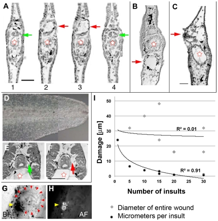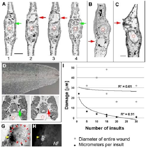 Figure 2. Histology of laser-pulse induced damage.(A) Sequential 8 µm sections through a region damaged by a single pulse. The extent of damage was two sections. Red stars indicate the notochord, which was not visibly damaged by the laser pulse. In contrast, the spinal cord was dramatically damaged; green arrows point at the undamaged spinal cord; red arrows point to damage. Scale bar = 500 µm. (B) Section showing damage in ventral somite after 15 insults. (C) Section showing damage in the shoulder spinal cord after 15 insults. (D) Composite of a tail with particularly small melanocytes. (E,F) Sequential sections from the tail shown in D illustrating that the extent of damage/ablation depends strongly on the size of the melanocyte. In this example, damage is almost entirely restricted to the melanocyte itself (green arrow: undamaged melanocyte; red arrow: ablated melanocyte). (G) Image of a wound 8 days after healing at 22°C. The yellow arrowhead points to the cluster of dark pigment spots that appear at the site of laser damage. The red arrows point to the edges of what appears to be a scar formed where the pulses were delivered. Scale bar = 100 µm. (H) Epifluorescence (λex = 488) image of the wound in G. The arrow points to the autofluorescence emitted by some component of the pigmented cluster. (I) The relationship between the extent of a lesion (gray diamonds) and the damage per laser insult (black circles) as a function of number of insults. The extent of a lesion is calculated by number of section showing damage×8 µm per section.