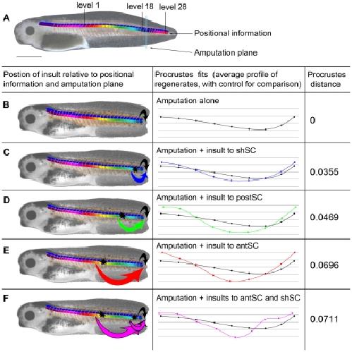 Figure 6. Model of morphogenetic information flow in regenerating tails.(A) An intact stage 40tadpole showing the complete information distribution along the tail. (BâF) A chart of morphogenetic information flow, where the first column shows schematic representations of the information flow, the second column shows the Procrustes fits for tails damaged at specific sites compared with the control, and the final column gives the Procrustes distance between the two shapes. (B) A tadpole with an amputated tail. This diagram shows the flow of information (green arrow) that has been activated by the amputation. The origin of this information is the undamaged tail immediately anterior to the amputation plane. This is equivalent to the control situation. (C) The flow of morphogenetic information in a tail damaged at one site, close to the amputation plane (upper and lower green arrows). These two sources of information are from similar levels along the AP axis, thus carry morphogenetic information that is essentially the same, leading to only a slight affect on the shape of the regenerate. This is equivalent to damaging the shoulder spinal cord (shSC). (D) The information from a more anterior damage site differs more from the information at the cut plane, thus introducing âconflictingâ information to the regeneration process, and causing significant variation in shape of the regenerate, like that caused by damage to posterior spinal cord (postSC). (E) Damage far from the amputation plane will lead to the presence of morphogenetic information even more in conflict with that at the amputation plane, thus causing a severe affect on shape, like damage to anteriorspinal cord (antSC). (F) The flow of morphogenetic information in a tail damaged at two sites. This panel illustrates how information from far anterior conflicts with both the amputation plane and the information from the other damage site, causing different and more severe changes in shape than either site alone, i.e., the greatest Procrustes distance.