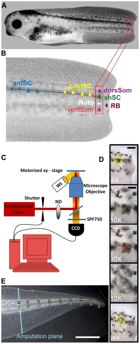 Figure 1. Illustration of the tadpoletail and techniques employed.(A) A stage 40 Xenopus tadpole shown 2â3 hours after amputation of one-third to one-half of the tail. (B) Enlargement of tail in A showing the regions targeted by the laser. Along the DV axis are the dorsal somite (dorSom); shoulder spinal cord (shSC), notochord (Noto), and ventralsomite (ventSom). Along the AP axis of the spinal cord are anteriorspinal cord (antSC); posterior spinal cord (postSC); and shoulder spinal cord (shSC). Scale barâ=â250 µm (C) Schematic of laser targeting setup. Pulses from an fs Ti:sapphire laser pass a shutter and neutral density filter (ND) before entering an inverted microscope housing a dichroic mirror (DM), microscope objective, and short pass filter (SPF). The tadpole sits atop a motorized x-y stage and is illuminated by white light (WL). The computer controls the shutter open/close duration and stage, while synchronously monitoring the specimen with a CCD camera. (D) Example of the five images that were recorded for each tail using 4à and 10à microscope objectives. Top to bottom they are: low magnification image before laser treatment, scale barâ=â150 µm; high magnification image used to focus and aim, scale barâ=â50 µm; high magnification record of the location and number of laser insults; high magnification image of laser damage; low magnification image of damage. (E) Image of a regenerated control tail including the position of the amputation plane (blue line) and the positions of the nine landmarks used for the Geometric Morphometrics analysis. Scale barâ=â1 mm.