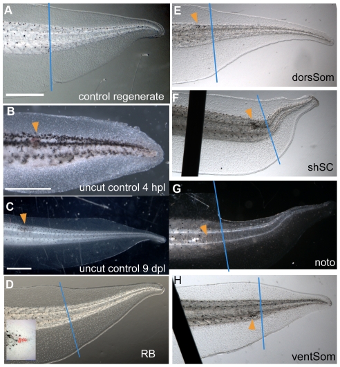 Figure 3. Phenotypes of tails damaged at the regeneration bud and at different levels along the DV axis of the shoulder region.Dorsal is up and posterior is to the right in all images. Typical phenotypes of regenerated tails imaged at stage 48. In all panels, the blue line indicates the amputation plane and the orange arrowhead indicates the position of laser-induced damage. Scale bar = 1 mm. (A) Control tail showing the normal shape of the regenerate. (B,C) Insults to spinal cord show normal development of the tail after 4 hours post laser (hpl) and 9 days post laser (dpl). (D) Image of regenerate after ablation of cells in the regeneration bud (RB: see inset). No observable difference was found when compared to the controls. (E) Ablation of dorsal somite (dorSom) cells does not affect regenerate shape. (F) Ablation of cells in the shoulder spinal cord (shSC) leads to an upward bend. (G, H) Targeting cells of the notochord (Noto) or ventral somites (ventSom) has no effect on regenerate shape. Dark lines in F and H are the staples used to hold tadpoles flat during imaging.