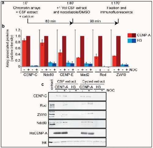 Figure 2. CENP-A chromatin specifically recruits kinetochore proteins as a response to a mimic of kinetochore detachment from microtubules(a) A schematic showing the experimental procedure. (b) Quantification of immunofluorescence analysis of CENP-C, Ndc80, CENP-E, Mad2, Rod or ZW10 recruitment to chromatin arrays with (+) and without (−) nocodazole (NOC). The levels are rescaled so that CENP-A arrays with (+) nocodazole are set at 1. Error bars represent SEM, n = 3 (p < 0.05 between − and + nocodazole for CENP-E, Mad2, Rod and ZW10 binding to CENP-A chromatin arrays). (c) Western blot analysis of CENP-C, Ndc80, Rod and ZW10 recruitment to CENP-A and H3 chromatin arrays with and without (+/−) nocodazole (NOC) in CSF and cycled egg extracts. H4 levels are shown as a loading control.