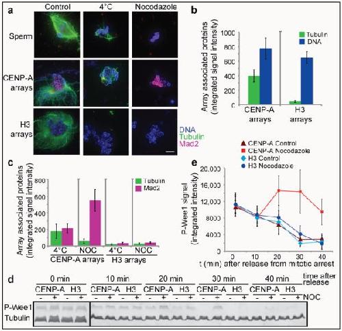Figure 3. Kinetochores assembled on reconstituted CENP-A chromatin bind microtubules and generate a mitotic checkpoint signal(a) Representative images of microtubule polymerization induced by sperm or reconstituted CENP-A and H3 chromatin. Microtubules (green) and Mad2 (magenta) levels are shown. Scale bar, 10μm (b) Quantification of tubulin and DNA associated with CENP-A and H3 chromatin beads. Error bars represent SEM, n = 5 (c) Quantification of tubulin and Mad2 levels associated with CENP-A and H3 chromatin beads after cold shock (4°C) and nocodazole (NOC) treatment. Error bars represent SEM, n = 5 (d) Western blot showing phospho-Wee1 (P-Wee1) levels as an indicator of the cell cycle stage and tubulin levels as a loading control. Samples from different time points after release from mitotic arrest (t 0′, t 10′, t 20′, t 30′, t 40′) are shown for CENP-A and H3 chromatin arrays, each incubated with nocodazole (+) or with DMSO (−) as a control. (e) Quantification of four independent experiments showing the phospho-Wee1 signal intensity (P-Wee1 signal) over time (min). Error bars represent SEM, n = 4.