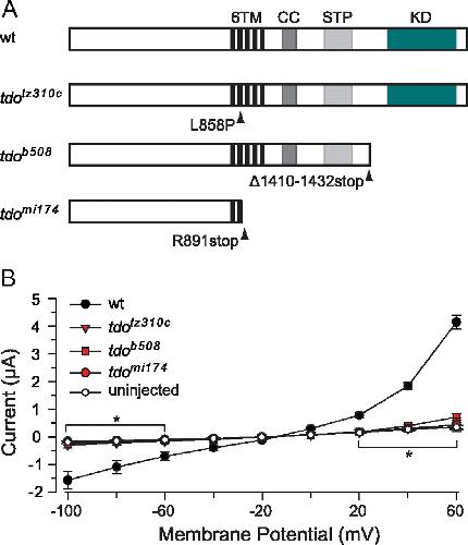 touchdown alleles tdotz310c, tdob508, and tdomi174 harbor mutations that abolish channel activity. A, A graphic representation of TRPM7 indicating the location of mutations in the three alleles of touchdown. CC, Coiled-coil domain; STP, serine-threonine-proline rich domain; KD, kinase domain. B, Average current responses of oocytes expressing wild-type TRPM7 or touchdown alleles to voltage ramps between −100 and +60 mV (n = 10 oocytes for each allele) showing that all three alleles lack channel activity (i.e., the currents in response to ramps were not significantly different from those of uninjected oocytes). Values represent the average ± SEM. *p < 0.05, t test. |
