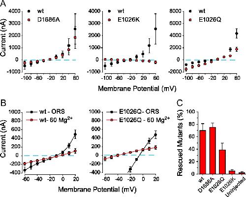 Restoration of touch-evoked responsiveness by expression of TRPM7 lacking kinase activity or with altered ion selectivity. A, Current–voltage relations of TRPM7 mutants expressed in Xenopus oocytes. Each point represents the average (±SEM) from 10 oocytes expressing the indicated construct minus the average from 10 uninjected oocytes at the same membrane potential. The membrane potential was changed by a slow ramp (3.3 mV/s) from −100 to +60 mV. Left, Response of a TRPM7 mutant lacking a residue necessary for kinase activity (TRPM7D1686A). Middle, Response of a TRPM7 mutant predicted to be pore killing (TRPM7E1026K). Right, Response of a TRPM7 mutant predicted to change the properties of the pore (TRPM7E1026Q). B, Current–voltage relations of wild-type or TRPM7E1026Q-injected oocytes in normal ORS containing 98 mM Na and 1.3 mM Mg, and a modified ORS with 8 mM Na and 60 mM Mg (60 Mg2+). C, Average ability of rescue plasmids harboring amino acid substitutions to restore touch-responsiveness in touchdown mutant larvae, which were identified by their hypopigmentation phenotype. |
