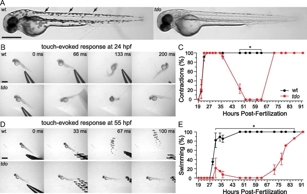 touchdown mutants are hypopigmented and display a transient loss of touch-evoked behaviors. A, Lateral view of wild-type (left) and touchdown mutant (right) larvae at 55 hpf. Arrows point to a few of the visible melanophores, which contribute to pigmentation in wild-type zebrafish but are missing in touchdown larvae. Scale bar, 200 μm. B, Frames of videos showing touch-evoked escape contractions at 26 hpf of wild-type (top) and touchdown (bottom) embryos. 0 ms is the video frame preceding contact of the embryo by the stimulating probe. Scale bar, 500 μm. C, The percentage of wild-type (black) and touchdown mutants (red) displaying touch-evoked contractions between 19 and 92 hpf (n = 24 from three clutches) showing that touchdown mutants do not respond between 52 and 63 hpf. Values represent the average ± SEM. *p < 0.05, t test. D, Video frames showing touch-evoked swimming at 55 hpf of wild-type (top) but not of touchdown (bottom) larvae. Of note, swimming larvae sometimes appear in two places as the behavior was faster than the sampling rate of the camera. Scale bar, 500 μm. E, The percentage of wild-type (black) and touchdown mutants (red) displaying touch-evoked swimming between 19 and 92 hpf (n = 24 from three clutches). |