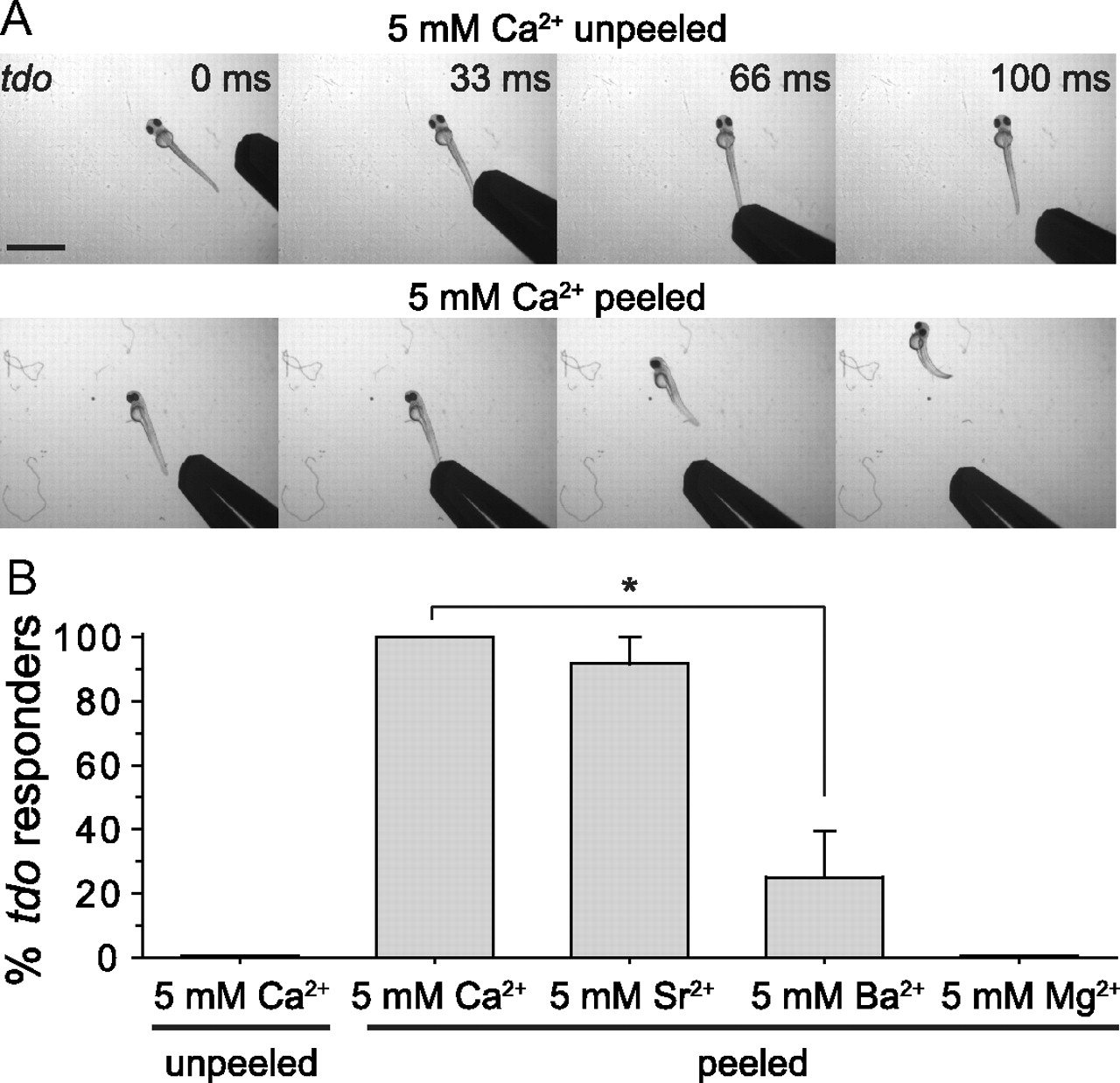 Elevation of extracellular divalent cations rescues touch responsiveness in touchdown mutants. A, Video images of 55 hpf touchdown mutant larvae in 5 mM Ca2+ showing no response to touch when the skin was not removed (top), and exhibiting swimming in response to touch when the skin over several rostral somites (∼5–10) had been peeled, allowing rapid diffusion of elevated divalent cations into the CNS (bottom). 0 ms is the video frame preceding contact of the embryo by the stimulating probe. Scale bar, 1 mm. B, Average responsiveness of unpeeled touchdown mutant larvae in the presence of 5 mM Ca2+ to tactile stimuli compared with peeled mutant larvae in the presence of 5 mM Ca2+, Ba2+, Sr2+, or Mg2+ (n = 15 from three clutches). Ca2+, Sr2+, and, to a lesser extent, Ba2+, but not Mg2+, increased responsiveness to touch of peeled touchdown mutants. *p < 0.05, t test. |