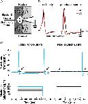 Tactile stimuli in touchdown mutants fails to activate second-order neurons and the locomotor network that generates swimming in zebrafish. A, Schematic of a minimal touch-evoked circuit in zebrafish. MN, Motor neuron; SM, skeletal muscle; HB, hindbrain; SC, spinal cord. Dashed line designates the dorsal midline; anterior is up. B, Extracellular recordings from wild-type and touchdown mutant larva using electrodes positioned to detect Mauthner neuron spikes showing that tactile stimulation activates M cells in wild-type but not touchdown larvae at 55 hpf. Gray bars indicate time of the stimulus to the puffer pipette. C, Several minutes of NMDA-evoked fictive swimming episodes recorded from axial skeletal muscle in a wild-type larva (55 hpf) in the presence of 3 μM curare, a concentration sufficient to attenuate membrane depolarization below the level necessary to induce excitationâcontraction coupling. D, A faster sweep of NMDA-evoked fictive swimming detailing episode period, episode duration, and swimming frequency (frequency of endplate potentials within an episode). The first episode lasted 1.06 s and had 22 peaks, for a swim frequency of 20.75 Hz. E, Cumulative plots of episode periods and durations in wild-type and touchdown mutant larvae showing that episode period and durations are not affected by the mutation. F, Histogram showing that the frequency of NMDA-evoked fictive swimming is comparable between wild-type and touchdown mutant larvae (n = 5 for each). |