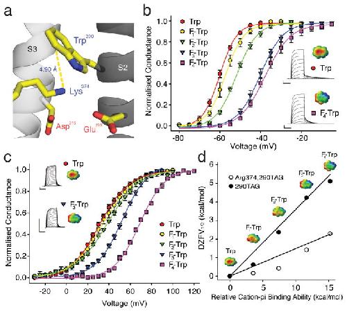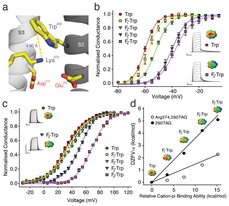Figure 5. A cation-pi interaction in the potassium channel voltage-sensor(a) A model highlighting the proximity of Trp290 and Lys374 (PDB 3LNM); (b) Effect of fluorination at Trp290 on GV; insets show currents and ESPs for Trp (upper) and 4,5,6,7-F4-Trp (lower) (n = 5–7); scale for ESPs: red = −25 kcal/mol, green = 0 kcal/mol, blue = +25 kcal/mol; Scale bars: 2 μA for current, 50 ms for time; (c) Effect of fluorination at Trp290 on the Arg374 background; insets show currents and ESPs for Trp (upper) and 5,6,7-F4-Trp (lower) (n = 4–6); scale for ESPs as in (b); (d) Cation-pi plot for fluorination of Trp290 with Lys or Arg in position 374. ESPs for Trp derivatives are shown with scales as in (b).