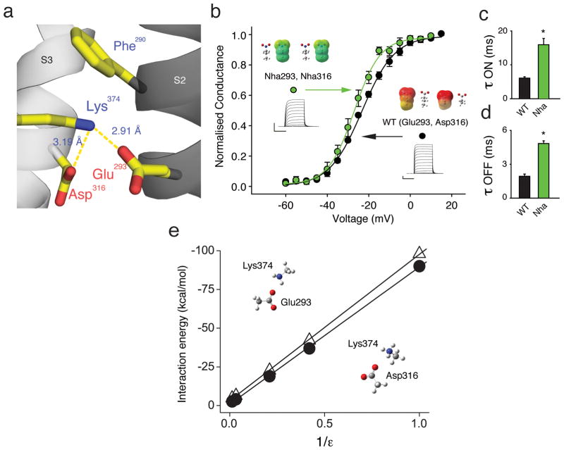 Figure 3. Glu293 and Asp316 do not contribute to a network of electrostatic charge-charge interactions(a) Model highlighting the proximity of Glu293 and Asp316 to Lys374 (PDB 2R9R); (b) Incorporating Nha simultaneously at positions 293 and 316 has only a minor effect on the GV (V1/2 = −27.2 ± 0.9 mV for Nha at positions 293 and 316 vs. V1/2 = −22.1 ± 0.7 mV for Glu in position 293 and Asp in position 316 (WT), n = 5); insets show currents, ESP maps and energy minimized structures with scale as in Fig. 2a; (c)/(d) Time constants of activation obtained from a depolarizing pulse from −80 mV to −25 mV (c) and time constants of deactivation obtained from a repolarizing pulse from +20 mV to −25 mV (d) for WT and for Nha simultaneously at positions 293 and 316 (all data fit with a single exponential, n = 5); asterisk indicates significant difference (p < 0.05); (e) Plot shows ab initio interaction energies at the HF/6-31G*+ level between Lys374 and Glu293 or Asp316 (open triangles or filled circles, respectively) in different dielectric environments. Side-chain moieties from PDB 2R9R were isolated, fixed and modeled as acetate (Glu and Asp) and methylammonium (Lys) in a variety of dielectric environments. All scale bars: 2 μA for current and 50 ms for time.