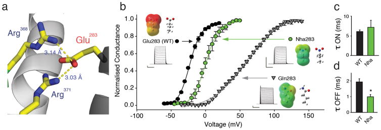Figure 4. Glu283 is likely to form a state-dependent electrostatic charge-charge interaction with S4 charges(a) Model highlighting the proximity of Glu283 to Arg 368 and Arg371 (PDB 2R9R); (b) Effects on GV by natural (Glu, Gln) and unnatural (Nha) side-chains at position 283 (V1/2 = 58.1 ± 2.0 mV for Gln283 (n = 4); V1/2 = 0.9 ± 2.1 mV for Nha283 (n = 8) and V1/2 = −22.1 ± 0.7 mV for Glu283 (WT)); insets show currents, ESP maps and energy minimized structures of natural and unnatural amino acids used at position 283 with scale for ESPs as in Fig. 2a; (c)/(d) Time constants of activation obtained from a depolarizing pulse from −80 mV to −25 mV (c) and time constants of deactivation obtained from a repolarizing pulse from from +20 mV (WT) or +40 mV (Nha283) to −25 mV (d) with Nha at positions 293 and 316 (all data fit with a single exponential, n = 5); asterisk indicates significant difference (p < 0.05); Scale bars: 2 μA for current, 50 ms for time.