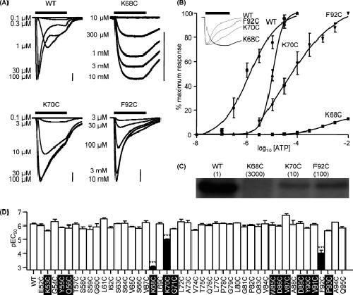 FIGURE 1. Effect of point cysteine mutations on ATP potency. Agonist action was tested on P2X1 WT and P2X1 receptor mutants expressed in oocytes by two-electrode voltage clamp (holding potential, −60 mV). A, concentration responses to ATP for oocytes expressing WT, K68C, K70C, and F92C mutant P2X1 receptors. ATP was applied for 3 s (indicated by the black bar; scale bar, 1 μA for all). B, summary of concentration response data for WT and mutants K68C, K70C, and F92C, which showed a significant decrease in ATP potency (n = 3–4). Error bars, S.E. The inset represents the slower response times of K68C, K70C, and F92C compared with WT in response to a maximum concentration of ATP. C, autoradiograph depicting radiolabeled [32P]2-azido-ATP cross-linked to WT and mutant receptors (mean EC50 for ATP (in μm) is shown in parentheses). D, summary showing pEC50 values of all mutants compared with WT (left). Values are shown as means ± S.E. Significant differences from the wild type are indicated (***, p < 0.001). Conserved residues are highlighted in black. |