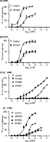 FIGURE 6. Effect of MTS reagents on the ATP potency of P2X1 receptor mutants. A, concentration-response curves of the P2X1 receptor mutant G60C with and without 1 mm MTSET. B, concentration-response curves of the P2X1 receptor mutant V87C with and without 1 mm MTSES. C, concentration-response curves of the P2X1 receptor mutants K68C (i) and K70C (ii) with and without a 1 mm concentration of the charged MTS reagents. All mutants were incubated in the presence of the MTS reagents for 3 h. Error bars, S.E. |