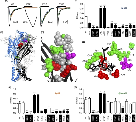 FIGURE 3. Effect of cysteine point mutations on partial agonist efficacy. Partial agonist action was tested on WT and P2X1 receptor mutants expressed in oocytes by two-electrode voltage clamp (holding potential, −60 mV). A, representative recordings of currents evoked by partial agonists (100 μm) compared with control ATP (100 μm) (black) for WT and mutants K68C, L72C, and Y90C. K68C and Y90C both show a decrease in efficacy of BzATP (blue) compared with the variable sensitivity of AP5A (amber) and α,β-MeATP (green), with L72C having an increased efficacy of all of the partial agonists. B, summary of all mutants demonstrating significant changes in efficacy of BzATP. C, schematic representation of the P2X1 receptor homology model; mutants that modified BzATP efficacy are shown as spheres. Red, decrease in ATP potency and reduced BzATP efficacy; green, no effect on ATP potency and reduced efficacy; magenta, no effect on ATP potency and increased efficacy. D, higher magnification of the region around the proposed ATP binding pocket showing mutants that change BzATP efficacy (same coloring as in C). E, molecular docking of BzATP to the P2X1 receptor shows that BzATP can fit within the proposed ATP binding pocket. Docking is shown for both ATP (in gray) and BzATP (in black), and residues that modified BzATP efficacy are shown (same coloring as in C and D). F and G, the effect of AP5A and α,β-MeATP on the corresponding mutants. Significant changes in efficacy are shown as black bars. *, p < 0.05; **, p < 0.01; ***, p < 0.001. Conserved residues are highlighted in black. Error bars, S.E. |