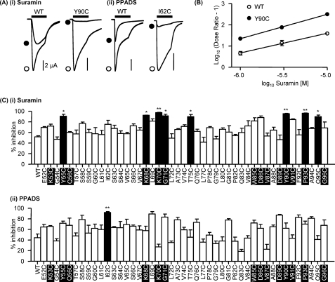 FIGURE 4. Antagonist action at P2X1 receptor mutants E52C to G96C. An EC90 concentration of ATP was applied to oocytes expressing P2X1 WT and P2X1 receptor mutants E52C to G96C. Antagonists were applied to the P2X1 receptor using concentrations that inhibited the WT response by ∼50%, suramin (3 μm) and PPADS (1 μm). A, representative recordings of Y90C (i), a P2X1 mutant with increased suramin sensitivity, and I62C, a P2X1 mutant with increased PPADS sensitivity (ii). Traces show the response in the presence of ATP only (open circle) and in the presence of ATP and the antagonist (closed circle). ATP was applied for 3 s (black bar), and the antagonists were bath-perfused 5 min before recording. B, Schild plot analysis of suramin antagonism at the WT P2X1 receptor and the mutant Y90C. C, percentage inhibition of EC90 concentration of ATP in the presence of the antagonists suramin (3 μm) (i) and PPADS (1 μm) (ii) on P2X1 receptor mutants E52C to G96C (n = 3–4). *, p < 0.05; **, p < 0.01. Error bars, S.E. Conserved residues are highlighted in black. |