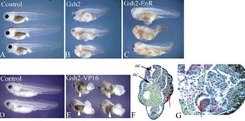 Fig. 1. Phenotypic effects of Gsh2 and Gsh2 fusion proteins. A-C: Phenotypes at stage 41 of X. tropicalis control embryos (A), and embryos injected with (B) 10 pg Gsh2, or (C) 50 pg Gsh2-EnR mRNA. D,E: Phenotypes at stage 33 of (D) control embryos, and (E) embryos injected into the leftventralblastomere with 15 pg of Gsh2-VP16 mRNA. All embryos are with anterior to the left and dorsal to the top. F, G: Section of an embryo from (E), at the level of Gsh2-VP16-induced partial secondary axis, histologically stained with borax carmine and picro blue-black. Nuclei stain red, cells green, and axons turquoise. nc, notochord; nt, neural tube. White arrows indicate partial secondary axes. Red arrows indicate ectopic neural tissue.