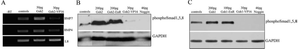 Fig. 2. Effects of Gsx proteins on bone morphogenetic protein (BMP) signaling. A: Reverse transcriptase-polymerase chain reaction (RT-PCR) analysis of expression of BMP4 and BMP7 in stage 14 X. laevis control embryos or embryos injected with mRNAs encoding Gsh2 or Gsh2-VP16 as indicated. B,C: Western blot analysis of stage 11 X. laevis embryos injected with mRNAs as indicated, and blotted with antibodies against PhosphoSmad1/5/8 and GAPDH as a loading control. B: Gsh2 and Gsh2 fusion proteins. C: Gsh1 and Gsh1 fusion proteins. Noggin is used as a control for BMP signaling inhibition.