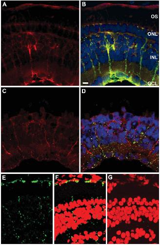 retinas in C and D. Red ¼ CRBP1; green ¼ glutamine synthetase; blue ¼ nuclei; and yellow