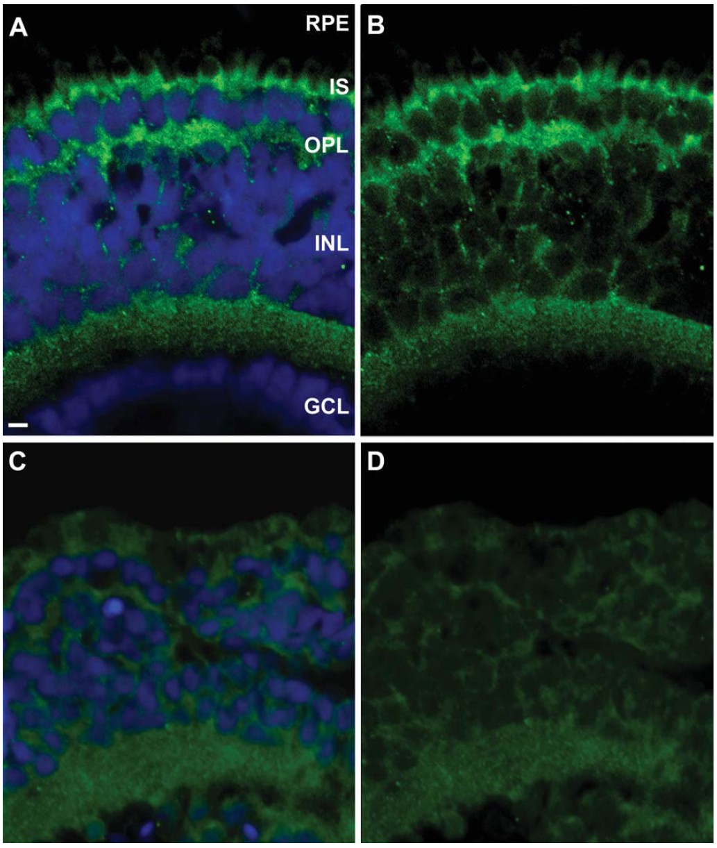 Figure 4 AâD: Localization of CRBP1 protein in the RPE and Mu¨ ller cells using immunohistochemistry.