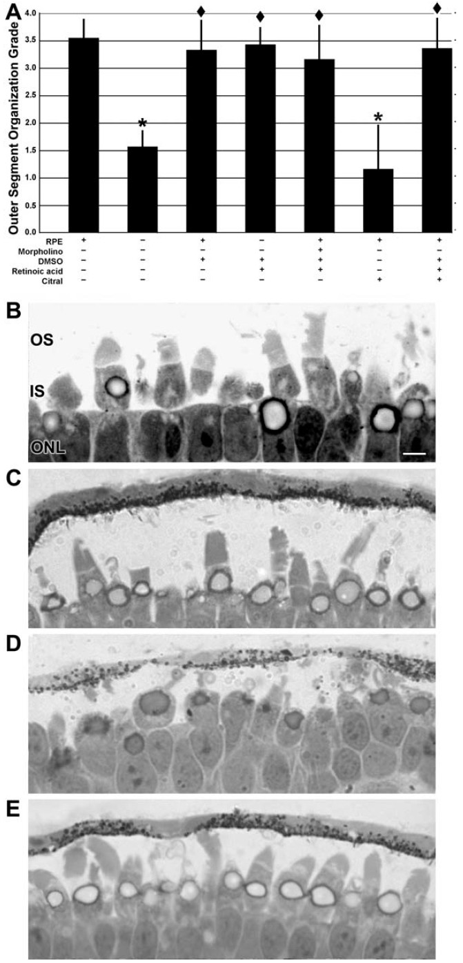 In a previous study, we used differential proteomics to identify retinal proteins whose steady-state levels were altered in an experimental system in which photoreceptor outer segments were improperly folded. We determined that the steady-state level of cellular retinol binding protein 1 (CRBP1) was downregulated in eyes lacking organized outer segments. The purpose of this study was to determine if CRBP1 is a plausible candidate for regulating outer segment assembly. We used Morpholinos to directly test the hypothesis that a decreased level of CRBP1 protein was associated with the misfolding of outer segments. Results from these studies indicate that downregulation of CRBP1 protein resulted in aberrant assembly of outer segments. Because CRBP1 plays a dual role in the retina-retinal recycling and generation of retinoic acid-we evaluated both possibilities. Our data demonstrate that outer segment folding was not modified by 11-cis retinal supplementation, suggesting that CRBP1 influences outer segment assembly through a mechanism unrelated to rhodopsin regeneration. In contrast, retinoic acid is required for the proper organization of nascent outer segment membranes. The localization of CRBP1 within Muller cells and the RPE and its demonstrated role in modulating the proper folding of nascent outer segment membranes through retinoic acid further elucidates the role of these cells in directly influencing photoreceptor physiology.