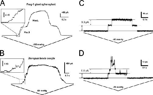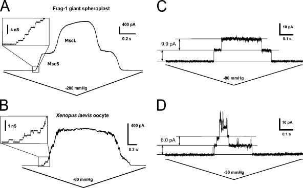 Figure 2. MscS conductance in oocytes is comparable to that in E. coli. (A) MscS and MscL channel activities in spheroplasts, recorded in 200 mM KCl plus 90 mM MgCl2. (B) MscS channel activity in oocytes, recorded in 96 mM NaCl plus 2 mM KCl (ND96). (C) Opening and closing of single MscS channels in response to stretch in an excised Xenopus oocyte patch. Pipette, BN 5. (D) Single-channel conductance measured in 98 mM TEA-Cl. Pipette, BN 7. Pipette potential was +40 mV in A and B, +30 mV in C and D.