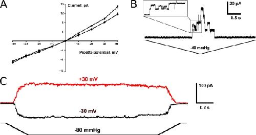 Figure 3. MscS exhibits low voltage dependence when expressed in oocytes. (A) The current–voltage relationship for MscS in symmetric ND96 (squares; n = 7 patches) and in TEA-Cl (diamonds; n = 4 patches). Error bars indicate standard deviation. (B) Example of conductive substates as recorded at +40-mV pipette potential. (C) Nearly symmetric activation curves recorded at opposite potentials in the same excised patch.