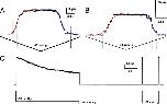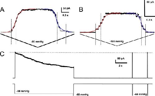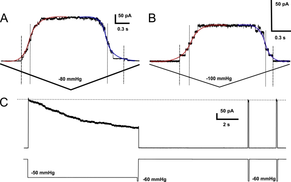 Figure 4. Activation and inactivation behavior of MscS expressed in oocytes. (A) Representative trace from a short triangle stimulation ramp; pipette, BN 7. (B) Hysteresis of MscS is more prominent in small patches (pipette, BN 5). In A and B, slope fits for channel opening are shown in red and for channel closing in blue; dashed and dotted lines indicate threshold and midpoint tensions, respectively. Pipette potential was +40 mV. (C) Slow inactivation at subsaturating pressure with subsequent recovery during saturating tension pulses.
