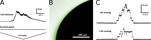 Figure 1. Suitability of Xenopus oocytes for the expression of bacterial mechanosensitive channel MscS. (A) Inactivation of endogenous mechanosensitive channels upon patch excision. Traces from the same water-injected oocyte are shown in cell-attached configuration (top) and excised-patch (bottom). Pipettes with BN 7 at a potential of +40 mV were used. (B) Confocal scan showing a portion of an oocyte expressing MscS-GFP 4 d after injection. Bright field and GFP signal (in green) are superimposed. (C) MscS activation by negative and positive pressure in the pipette, as recorded from the same excised patch in symmetric ND96 buffer. Pipette potential was +30 mV with BN 6.