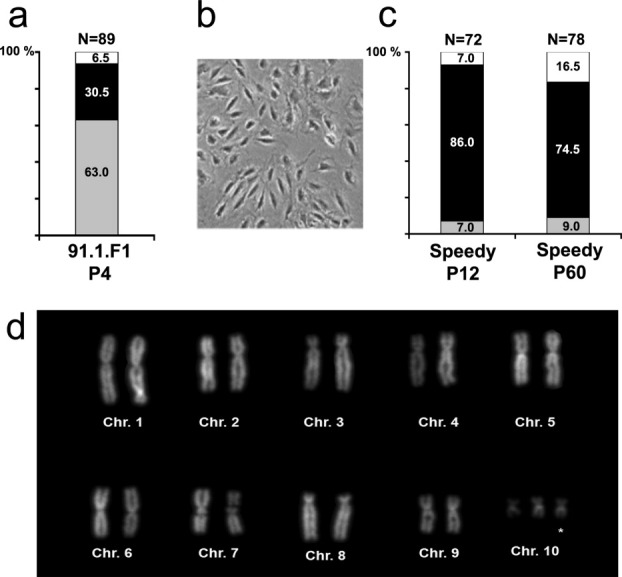 Figure 1. Biological and cytological characterization of the primary cell line 91.1.F1 and the secondary Speedy cell line originating from a X. tropicalis limb. (a) Chromosome assay on 91.1.F1 cells at passage 4. Histogramme color code is gray: 20 chromosomes per metaphase; black: 21 chromosomes; white: less than 20 or more than 21 chromosomes. (b) Morphology of Speedy cells in phase-contrast microscopy. (c) Chromosome assay on Speedy cells at passages 12 and 60. Histogram color code as in a. (d) Karyotype of Speedy cells.