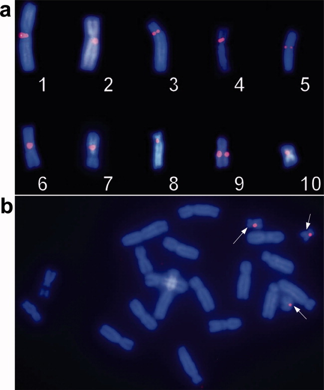 Figure 2. Cytological localization of centromeric markers on Speedy chromosomes by FISH. (a) Probe names and corresponding genes (Khokha et al.,2009: Chr1/LG1 : mast3; Chr2/LG6 : epb41; Chr3/LG8 : gemin5; Chr4/LG7 : znf423; Chr5/LG9 : olig3; Chr6/LG2 : fbxl7; Chr7/LG4 : mat1a; Chr8/LG5 : naif1; Chr9/LG3 : stat4; Chr10/LG10 : ezh1. (b) Representative image of FISH analysis of chromosome 10 centromeric probe performed on Speedy cells. The white arrows show fluorescent signals at the centromeric area of all three chromosome 10.