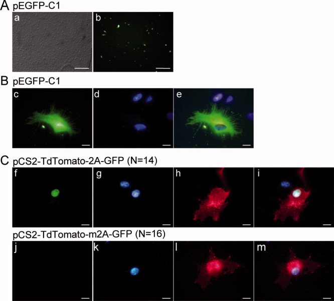 Figure 3. Expression and cellular localization of fluorescent proteins in Speedy cells. (a) Transfectability of speedy cells at 48 h after transfection of pEGFP-C1 plasmid. Scale bar represent 600 μm. (b) Representative images of fluorescent cells transfected with the pEGFP-C1. (c) Representative images of fluorescent cells transfected with the pCS2-TdTomato-2A-GFP and the pCS2-TdTomato-m2A-GFP. (f, j) EGFP fluorescence; (g, k) DAPI staining; (h, l) TdTomato fluorescence; (i, m) Merge of EGFP, DAPI and TdTomato fluorescence. ≪ N ≫ indicates the number of cells observed from two independent transfection experiments. Scale bars represent 10 μm.